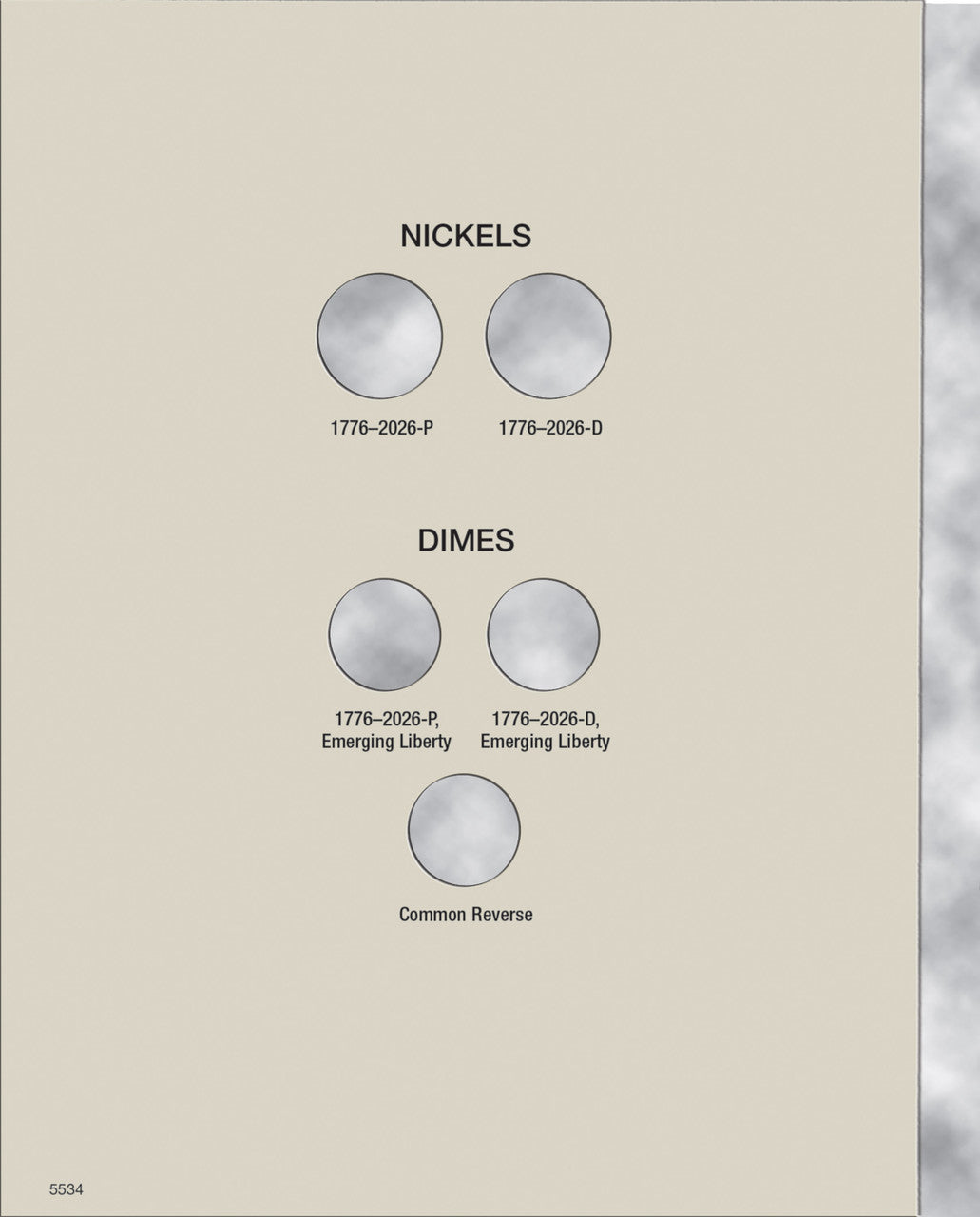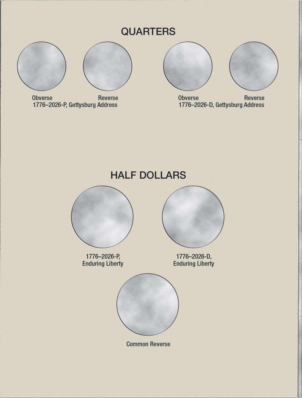 Clearly marked openings make coin placement and identification easy, with brief historical context, mintage figures, and series information included. This folder features three panels with 28 openings for circulation-strike coins from the Philadelphia and Denver mints dated 2026, commemorating the 250th Anniversary of the United States.